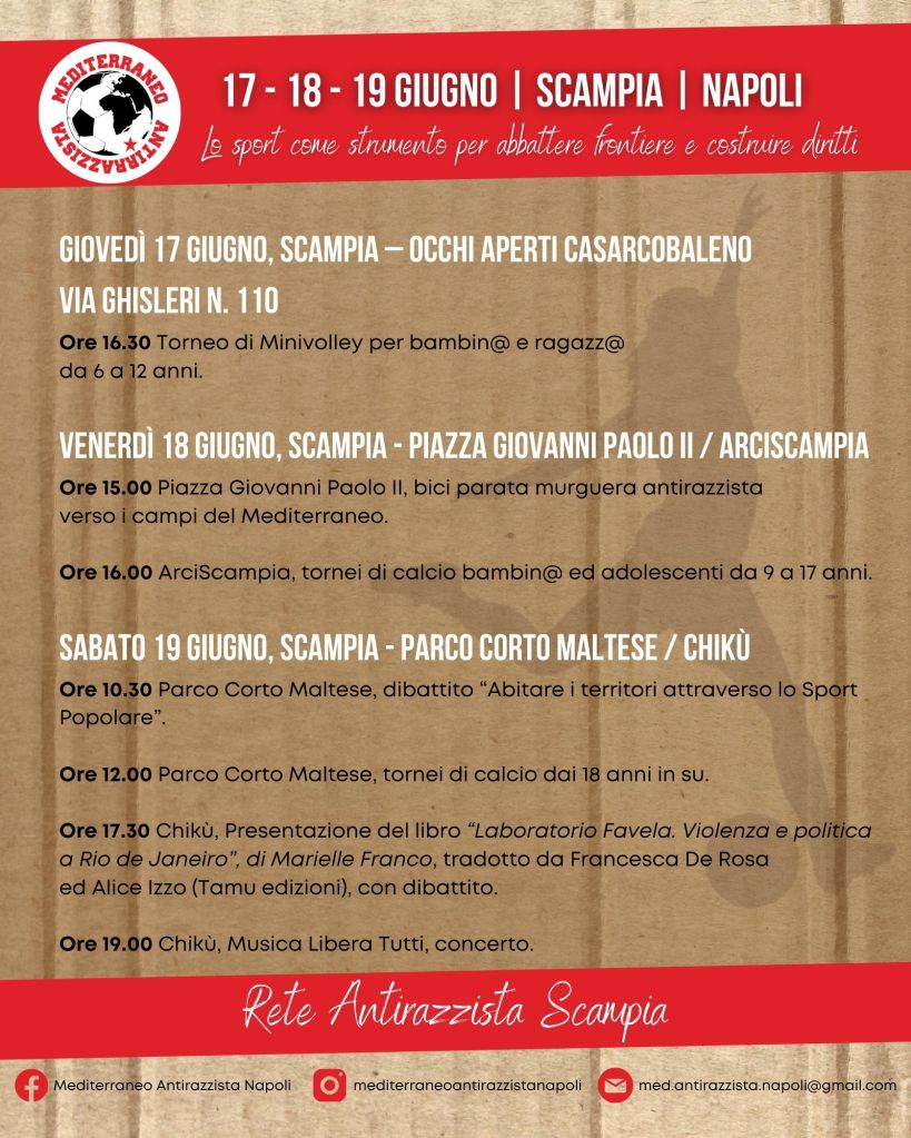 Anche quest’anno, per il nono anno, Napoli rinnova il suo impegno nel percorso del Mediterraneo Antirazzista, manifestazione culturale e sportiva di carattere nazionale che nasce a Palermo 16 anni fa, e che vede al centro “lo sport come strumento per abbattere frontiere e costruire diritti”.